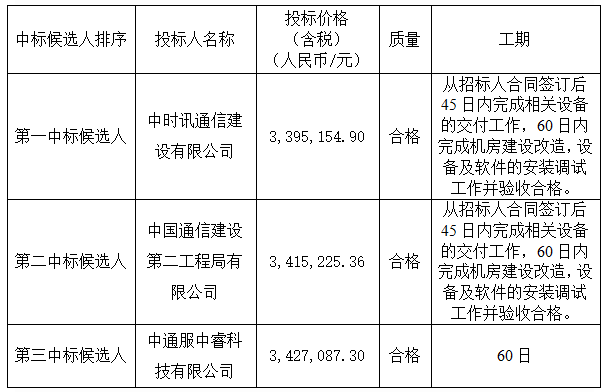 广东省机电设备招标有限公司(以下简称“招标代理机构”)受广东南方报业传媒集团有限公司(以下简称“招标人”)的委托,就“南方报业传媒集团数据中心机房改造二期”进行国内公开招标,经评标委员会的评审推荐和招标人的确认,现公示本项目的中标候选人如下:
