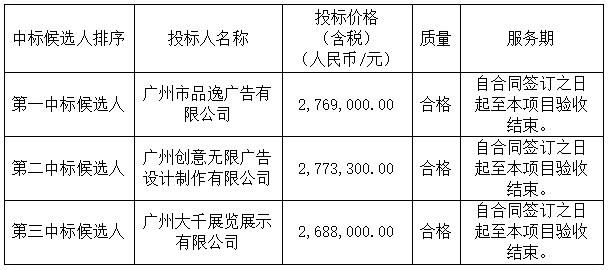 广东省机电设备招标有限公司(以下简称“招标代理机构”)受广东南都娱乐传媒股份有限公司(以下简称“招标人”)的委托,就“大型宣介活动服务保障”进行国内公开招标,经评标委员会的评审推荐和招标人的确认,现公示本项目的中标候选人如下: