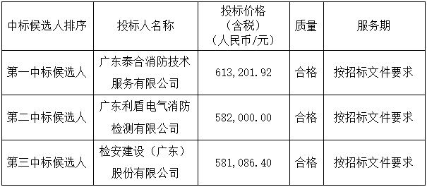 广东省机电设备招标有限公司(以下简称“招标代理机构”)受广东南方报业传媒集团物业管理有限公司(以下简称“招标人”)的委托,就“集团大院媒体区消防系统设备设施维护保养服务”进行国内公开招标,经评标委员会的评审推荐和招标人的确认,现公示本项目的中标候选人如下: