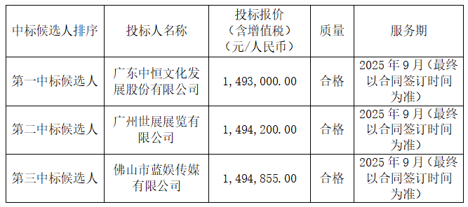广东省机电设备招标有限公司(以下简称“招标代理机构”)受广东南方农村报经营有限公司(以下简称“招标人”)的委托,就“名优产品走进大湾区展销活动”进行国内公开招标,经评标委员会的评审推荐和招标人的确认,现公示本项目的中标候选人如下: